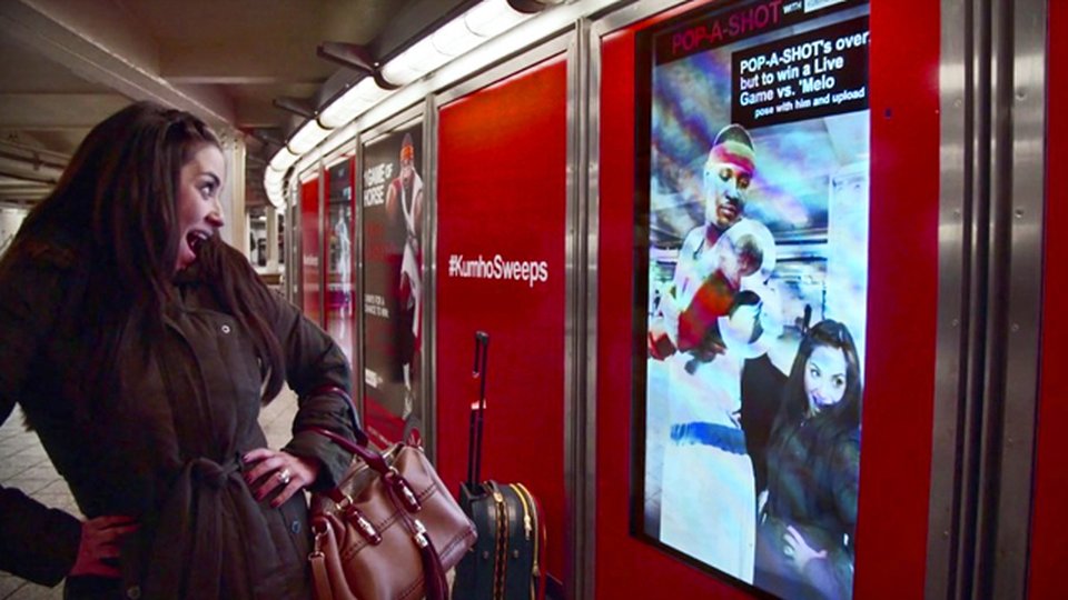 An interactive digital signage deployment for Kumho Tire in a Times Square subway station created by experiential agency Pearl Media features a virtual "Pop-A-Shot" game and the Knicks forward in a campaign timed to coincide with the annual NBA All-Star Game, held earlier this month in New York City's Madison Square Garden, home of the Knicks.