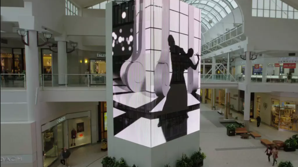 Arden Fair Mall, a mall located in Sacramento, California, took advantage of this principle by integrating a combination of high and low resolution displays on three sides of its central court elevator, as seen below in this video.