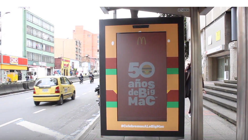 The companies deployed an interactive display at a JCDecaux Colombia bus shelter in Bogota to celebrate the 50th anniversary of its trademark sandwich: The Big Mac. The outdoor displays challenged users to a dance off for a chance to win a McCoin, a McDonald's collectible item.