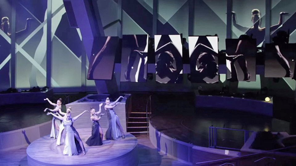 The signature venue on each ship is Two70°, a multilevel great room named for its 270-degree panoramic sea views through vast, floor-to-ceiling glass walls spanning almost three decks at the stern of the ship. That same grand vista can be transformed into a gigantic "Vistarama" screen that stretches more than 30 meters long (100 feet) and 6 meters tall (20 feet). With projection mapping digital signage technology at a 12K resolution, it provides a backdrop to the variety of dynamic entertainment that occurs on the transforming stage in front of it.