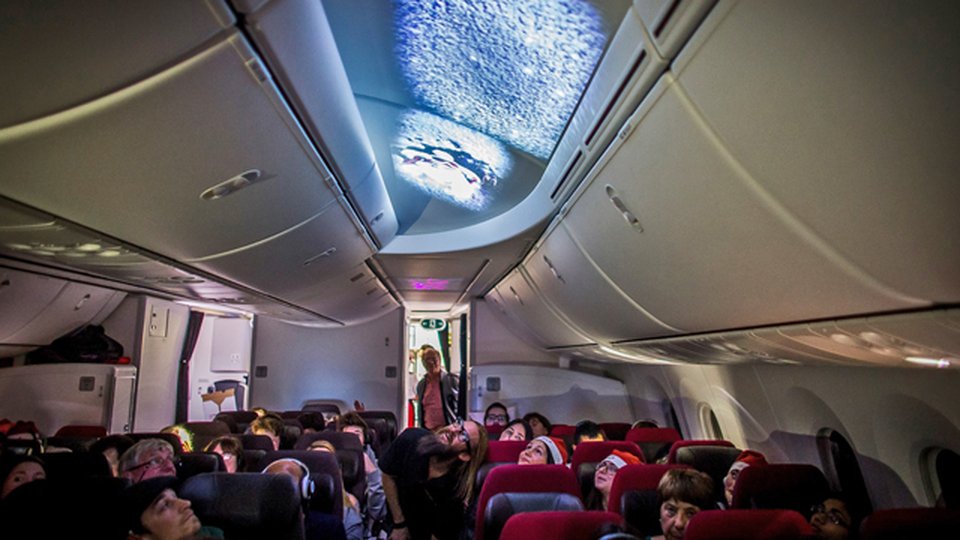 Via a series of projections onto the cabin ceiling, passengers watched the sleigh land on the aircraft before [Santa came] walking down the aisles, delighting children and taking selfies with surprised passengers. The passengers were then able to watch Santa prepare his crew for departure before heading off into the night sky.