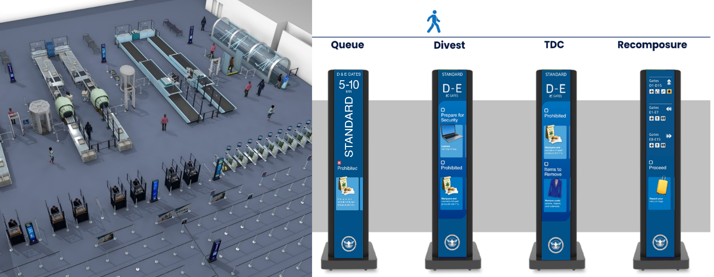 ReadySeeGo totems in a security checkpoint and showing Synect's better, faster security checkpoint program. Image: Synect |