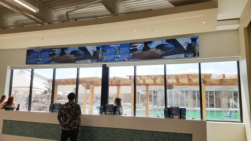 The facility uses the video wall to showcase the various dolphin experiences and how much each one costs. It can also control the content layout using ClearOne's View Pro Panorama video wall software.