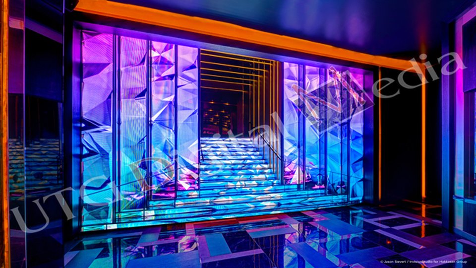JEWEL Nightclub is located within the ARIA Resort & Casino and spans over 24,000 square feet. The staircase features thousands of LED ribbons that are shock-absorbent and will display text, images, videos or a combination of mediums.