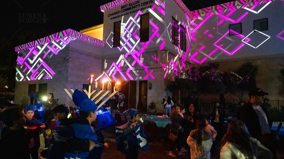 Immersive technology artists Lumen & Forge created a digital expression celebrating Hanukkah for the Chabad of Summerlin Community Center in Las Vegas, which includes projection mapping, a snow-globe theme geodesic dome, audio visual gear and lightning elements for the synagogue, according to a press release.