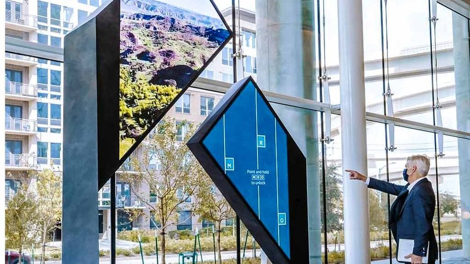 According to Sensory Interactive, the display blends art and motion capture technology that responds to visitors as they move through the space. The art piece, drawing inspiration from crystal shapes found in geology, passively relays foot traffic data, allowing screen content to adjust dynamically. Users can also interact with the piece through gesture tracking to explore Marathon Oil's history, learn about staff, and view a catalogue of content such as branded content, ambient/artistic content, and community content.