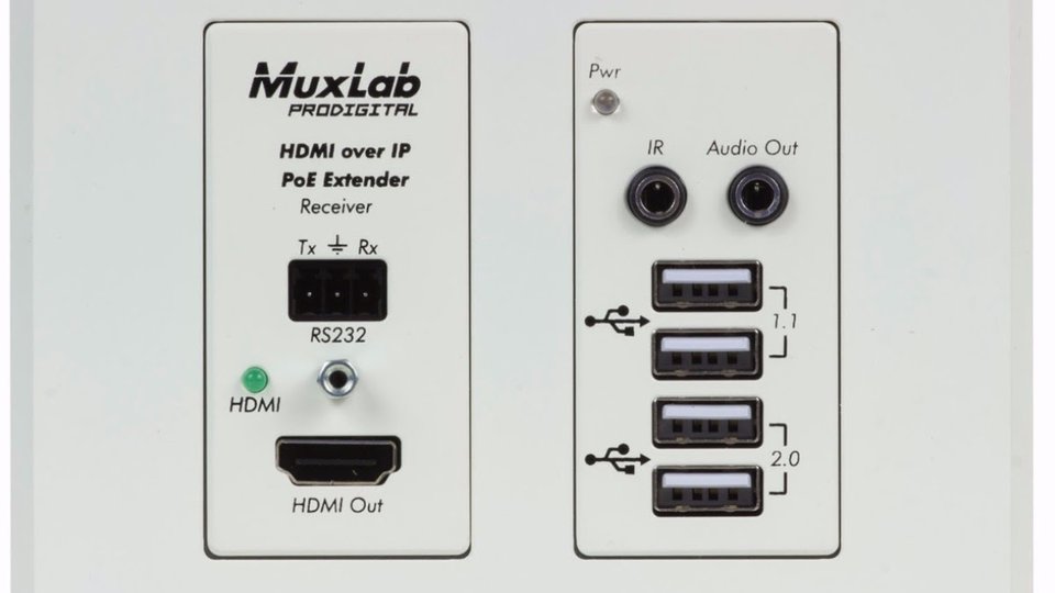 MuxLab has released its new HDMI/USB over IP power-over-Ethernet Wall Plate Receiver. This 500777-RX-WH model supports 4K video and works with MuxLab's HDMI/VGA/USB over IP PoE Wall Plate Transmitter, according to a press release.