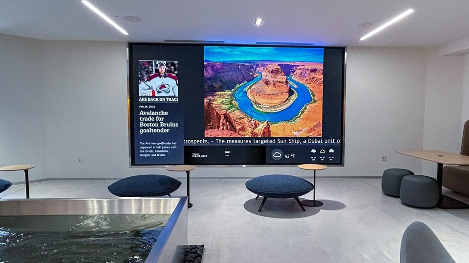 The 2.5mm LED video wall measures in at 8-feet by 14-feet-five-inches, with a resolution of 990 x1,760 pixels. The video wall was fashioned with panels from the SNA Displays Bold Interior product line and designed for variable light conditions, including daylight during daytime hours, while streaming live content like news.