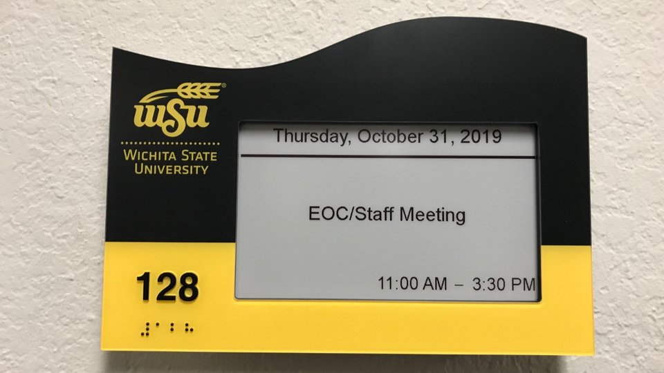 The Eugene M. Hughes Metropolitan Complex (Metroplex) is a 75,000-square-foot facility that houses university offices and meeting spaces. The Metroplex team wanted large displays in the pre-function and lobby areas of the building to broadcast building-wide event messages, with directional wayfinding arrows to guide visitors to the correct conference rooms. Visix's EPS room signs are surface mounted outside of each meeting space, with custom faceplates that display branding, room numbers and other content unique to each location.