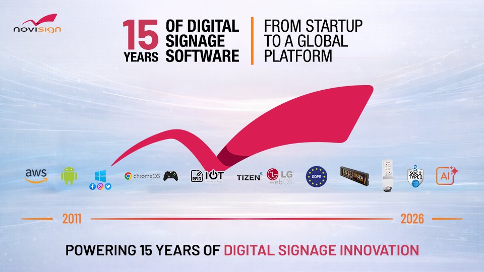 NoviSign marks 15 years of growth from a small idea into a global digital signage leader, powering 70,000+ screens. With a focus on flexibility, reliability, and innovation, especially AI, the company continues expanding its platform, partnerships, and impact worldwide.